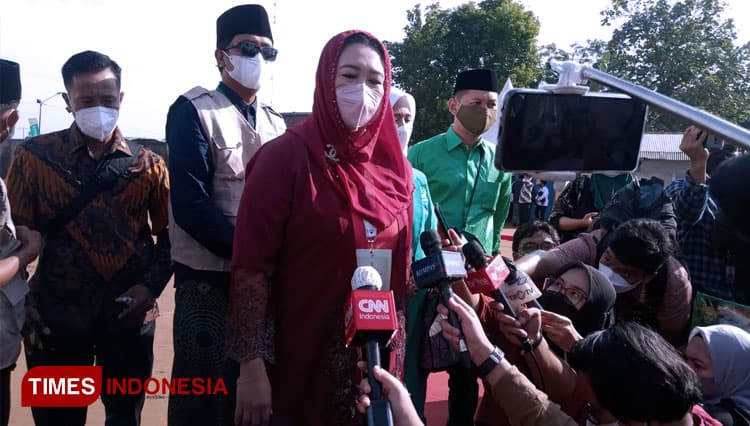 TIMES Cianjur/Putri Abdurrahman Wahid (Gus Dur) Yeny Wahid saat diwawancarai oleh awak media. (FOTO: Moh Ramli/TIMES Indonesia)