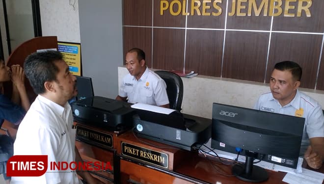 TIMES Cianjur/Wakil Ketua Bidang Litbang dan IT DPD Partai Perindo Kebupaten Jember, Ahmad One Prastiono saat melaporkan Ketua DPD Partai Perindo Kabupaten Jember Hanung Prijobodo ke Polres Jember, Senin (6/5/2019). (FOTO: Dody Bayu/TIMES Indonesia)